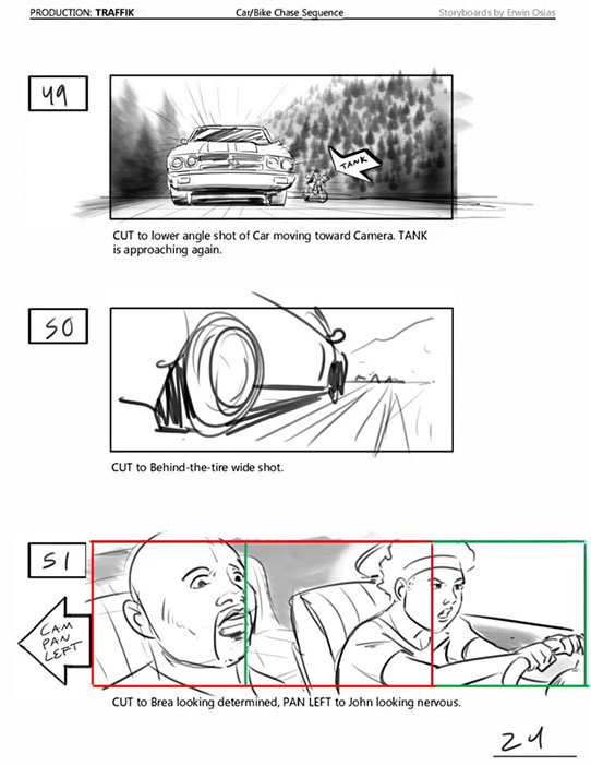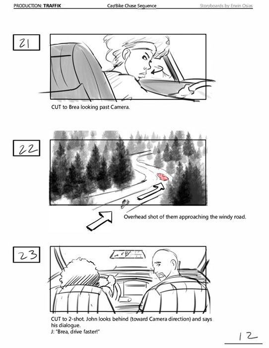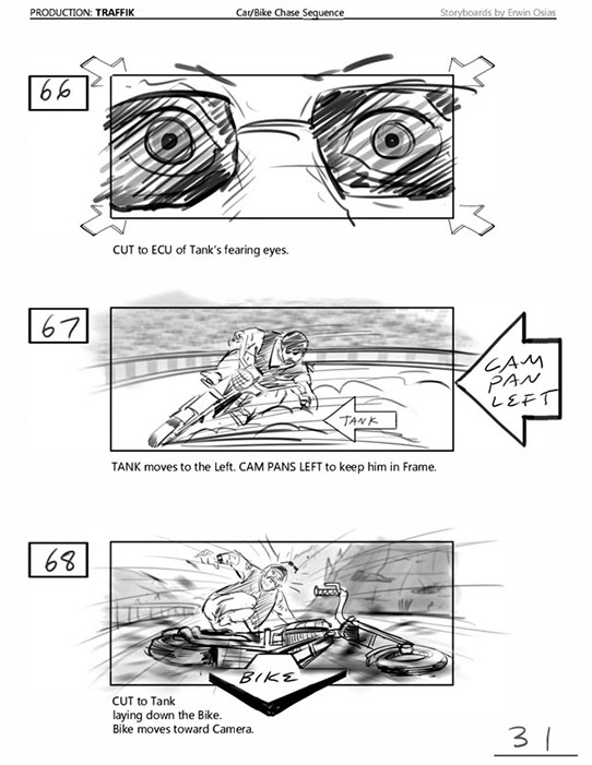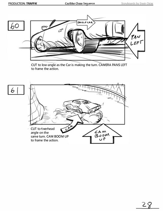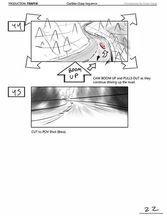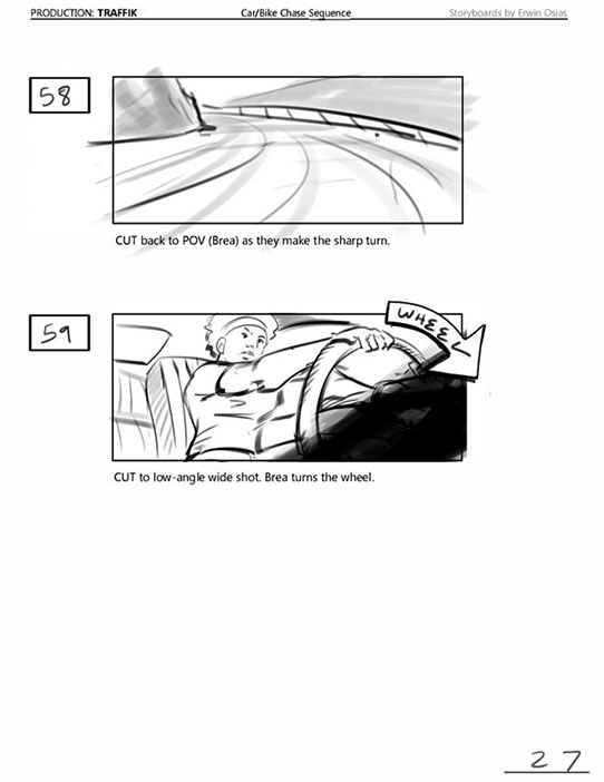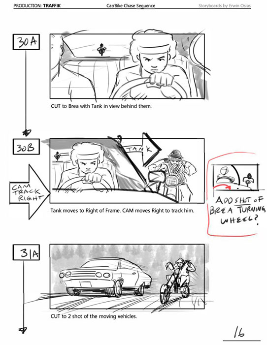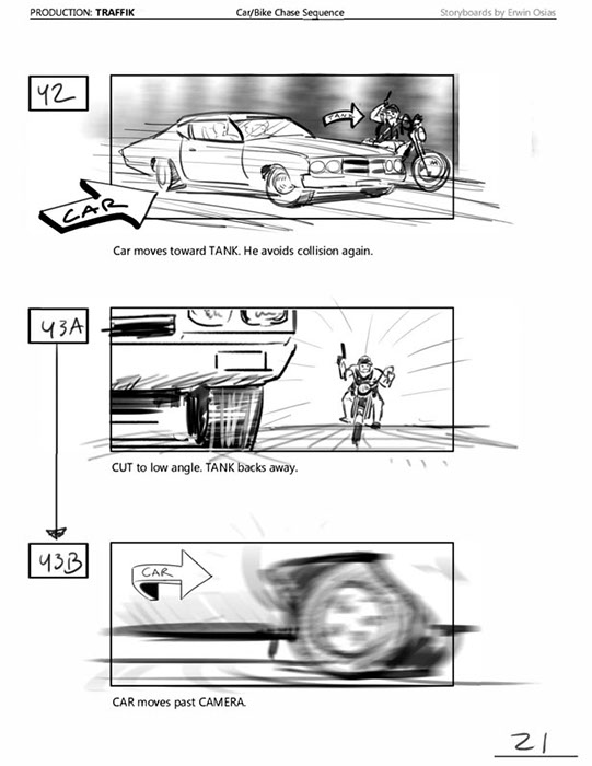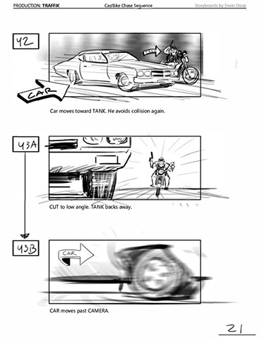 An early first pass on the car/bike chase sequence in the film, with the characters in reverse seating position compared to the final cut of the movie.
