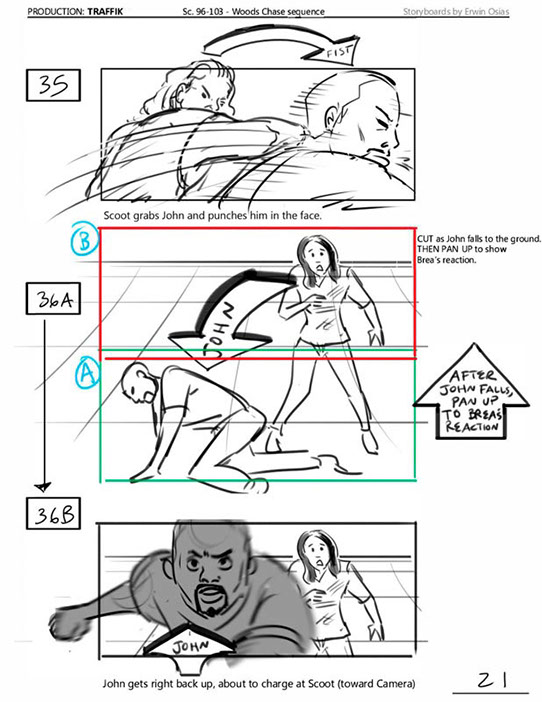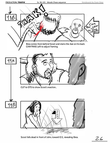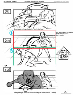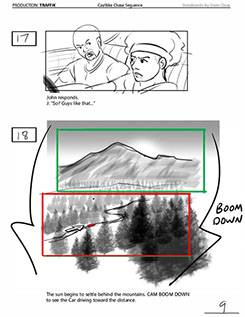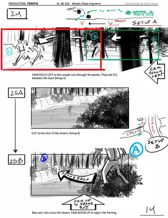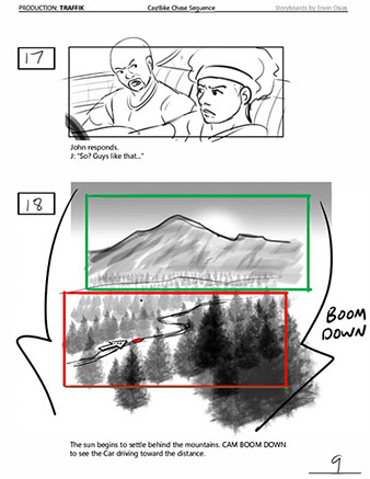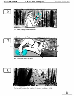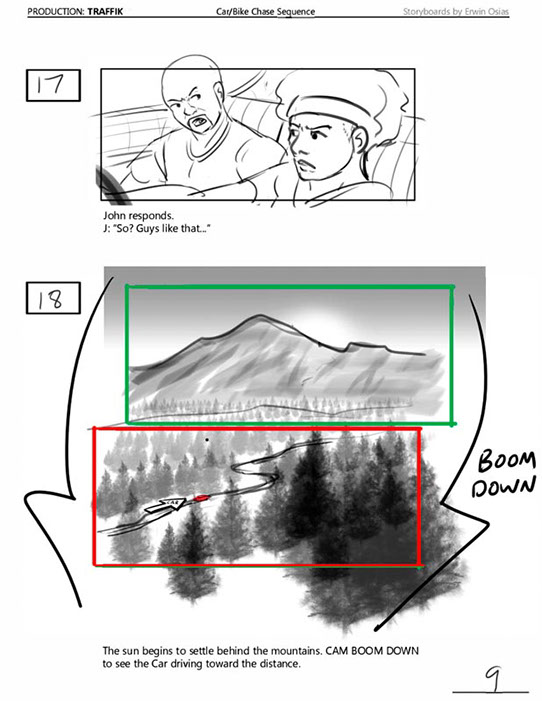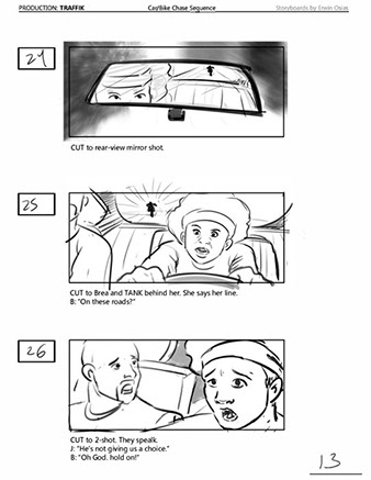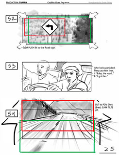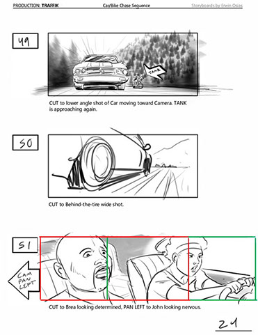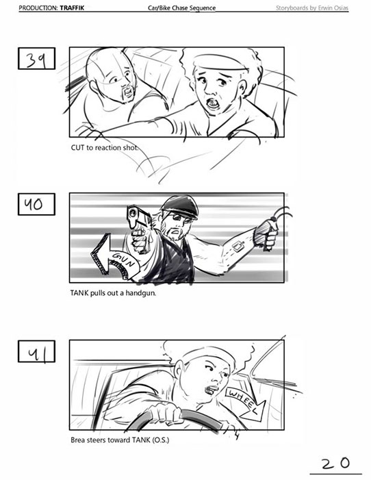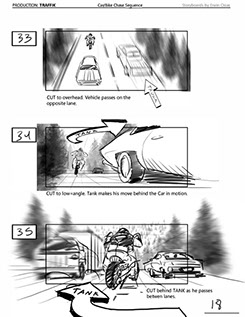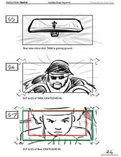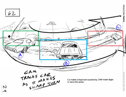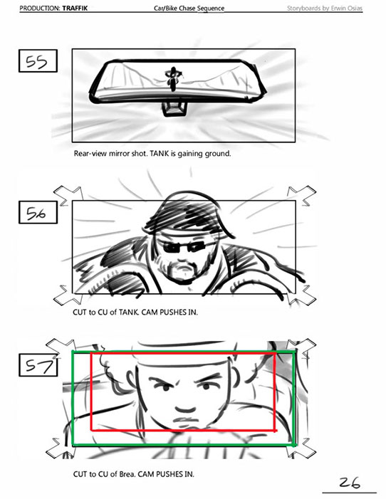 An early first pass on the car/bike chase sequence in the film, with the characters in reverse seating position compared to the final cut of the movie.